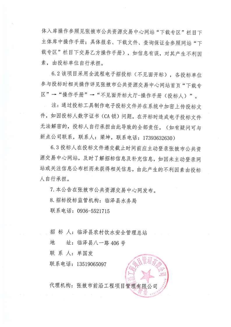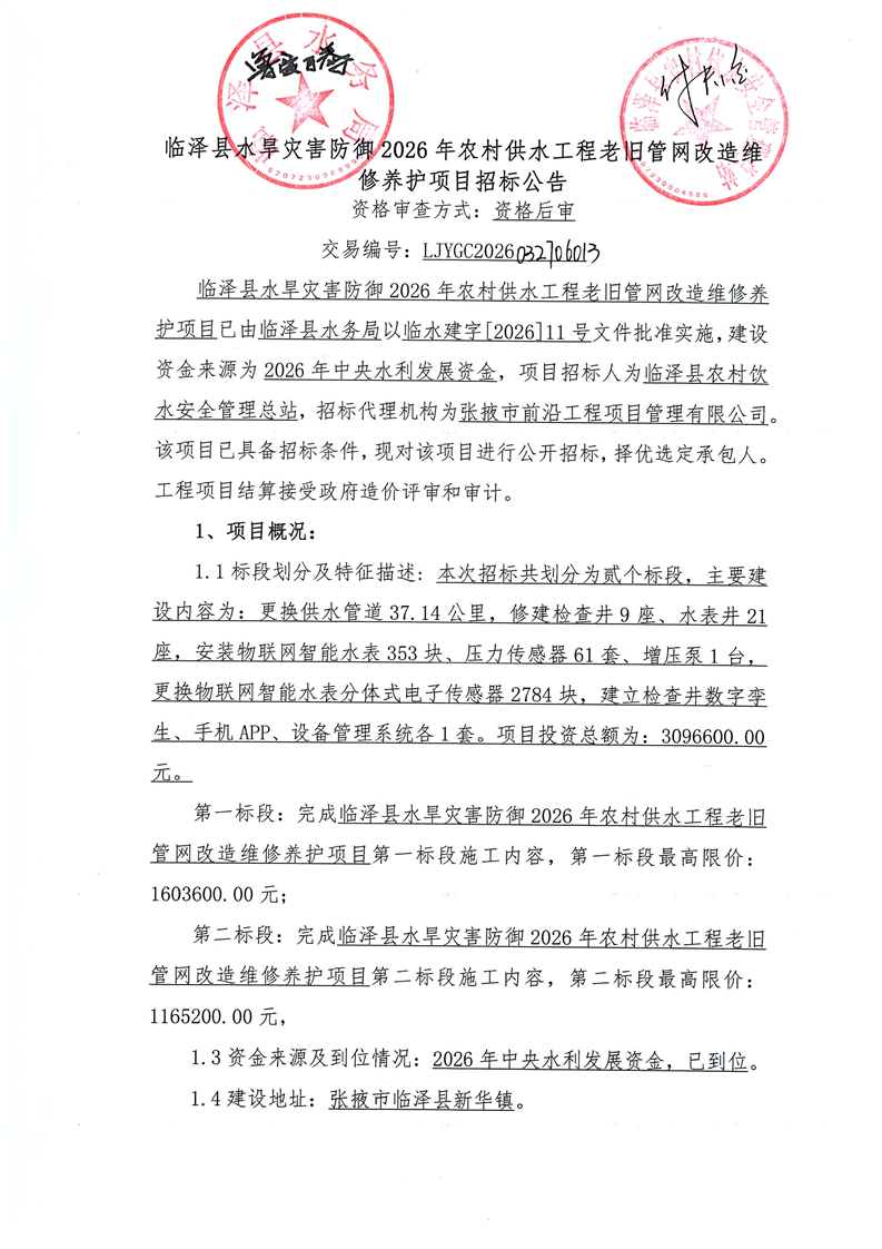 临泽县水旱灾害防御2026年农村供水工程老旧管网改造维修养护项目招标公告