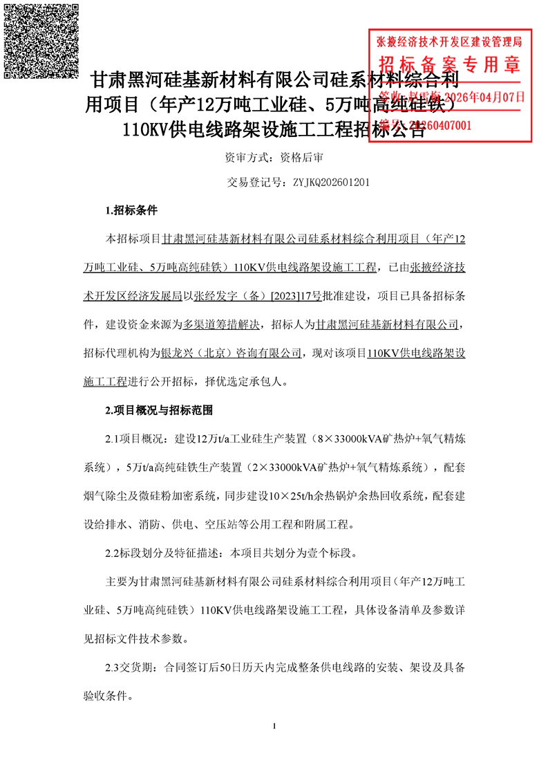 甘肃黑河硅基新材料有限公司硅系材料综合利用项目(年产12万吨工业硅、5万吨高纯硅铁)110KV供电线路架设施工工程