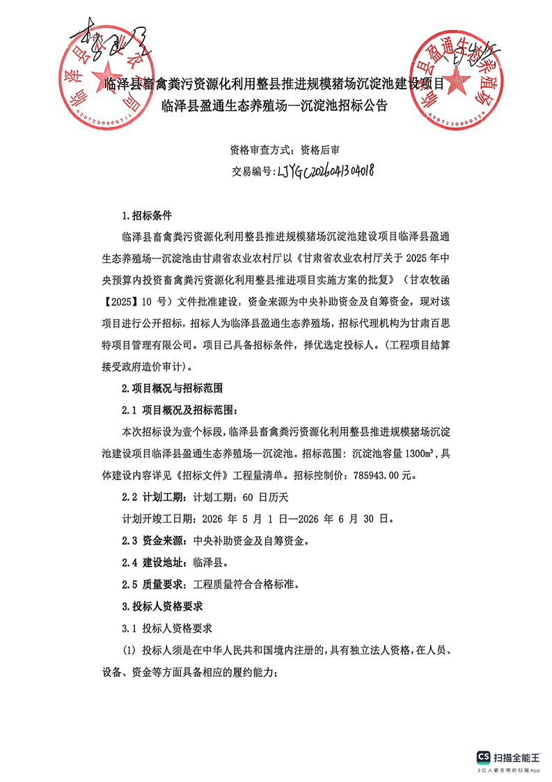 临泽县畜禽粪污资源化利用整县推进规模猪场沉淀池建设项目临泽县盈通生态养殖场—沉淀池招标公告