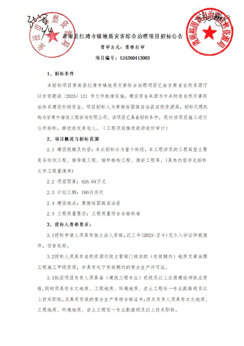 肃南县红湾寺镇地质灾害综合治理项目招标公告